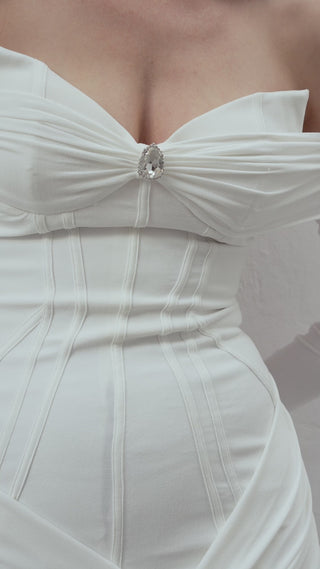 The BIANCA Dress features a ruched mini cut that leaves the shoulders bare, accented with corset details. The texture of the fabric and the matching gloves create a harmonious finish, leaving a captivating impression as it moves under the light.
