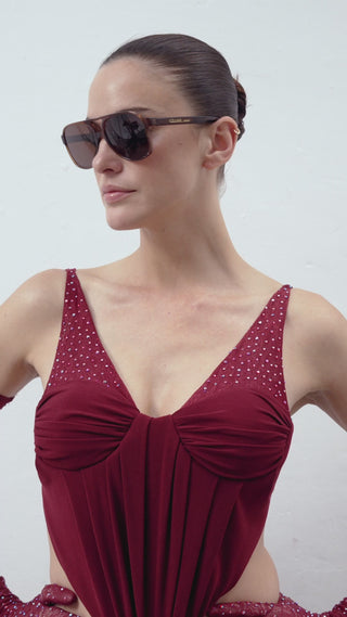 The VINA Dress stands out with its stone-embroidered details and graceful cut. Its maxi length, paired with matching gloves, creates a striking and memorable look in a rich cabernet hue.